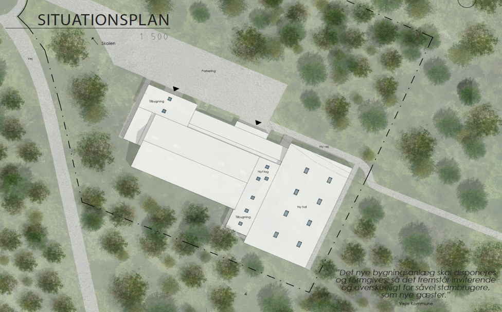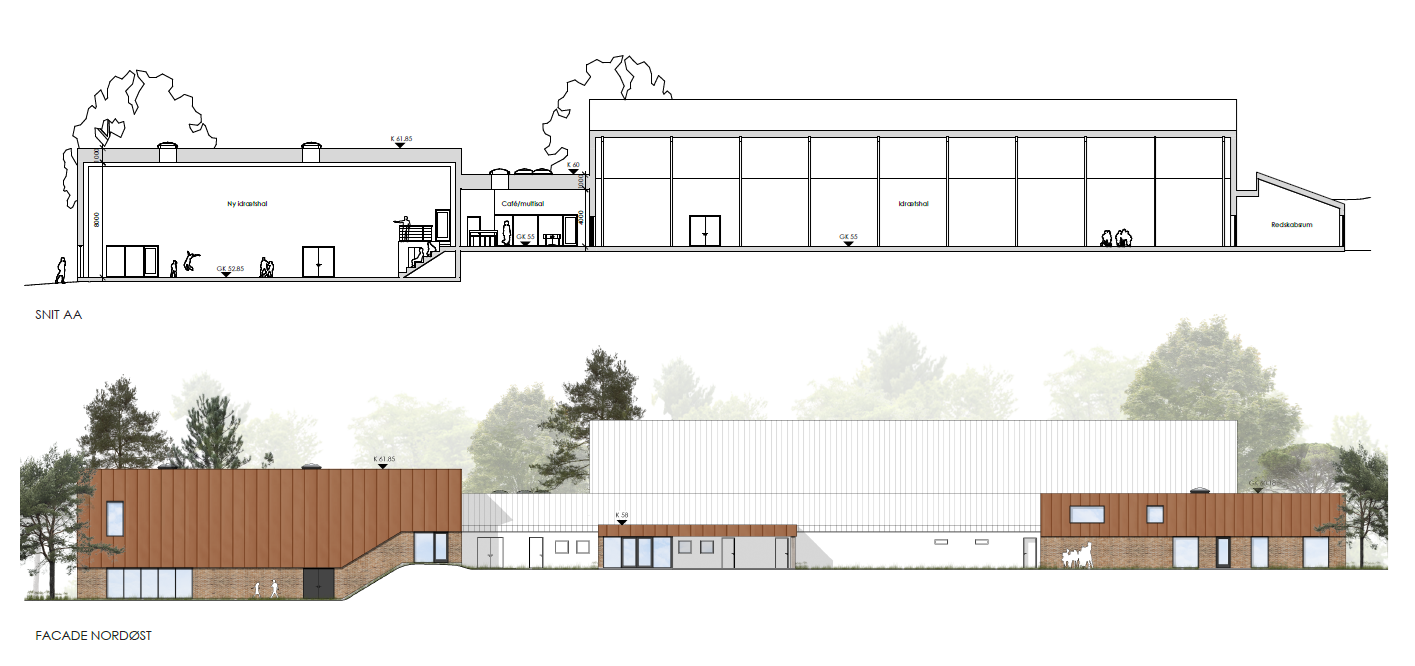 I tilknytning til de eksisterende idrætsfaciliteter indeholder projektforslaget etablering af en ny hel hal og en multisal. Der etableres nye omklædningsrum, depoter og klublokale til dele af skolens fritidsliv med egen indgang og placeret tæt på skolen. Eksisterende indgangs- og ankomstområde åbnes op, og café/opholdsområdet renoveres og udvides. I umiddelbar nærhed af opholdsområdet etableres mødelokale.