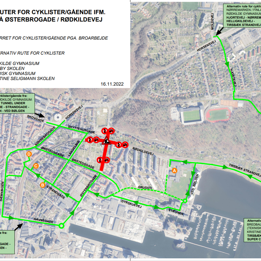 Fra 27. december 2022 og frem til arbejdets afslutning i december 2024 er det ikke muligt for cyklister og gående at benytte Østerbrogade.