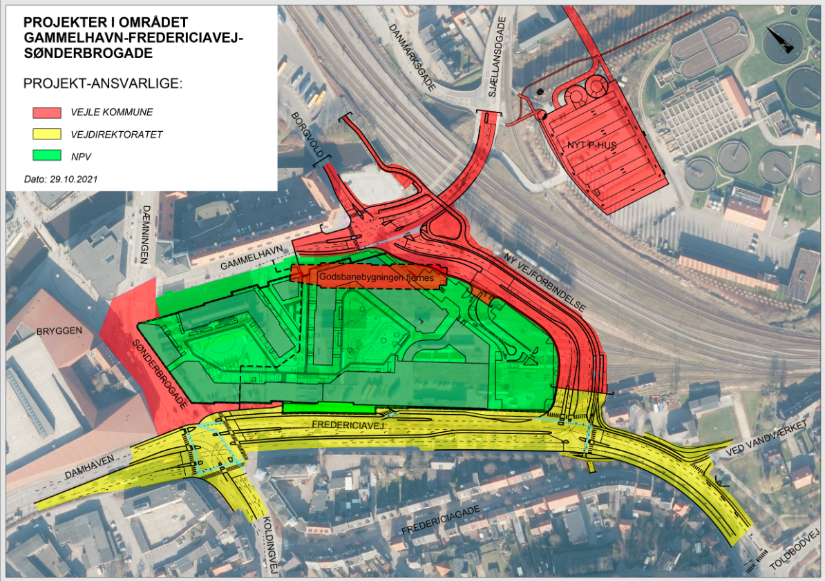 - Vejle Kommune: Har anlagt Ejgil Jensens Vej og parkeringshuset ved tunnelen mellem Gammelhavn og Sjællandsgade. Det er også Vejle Kommune, der har taget Godsbanebygningen ned.