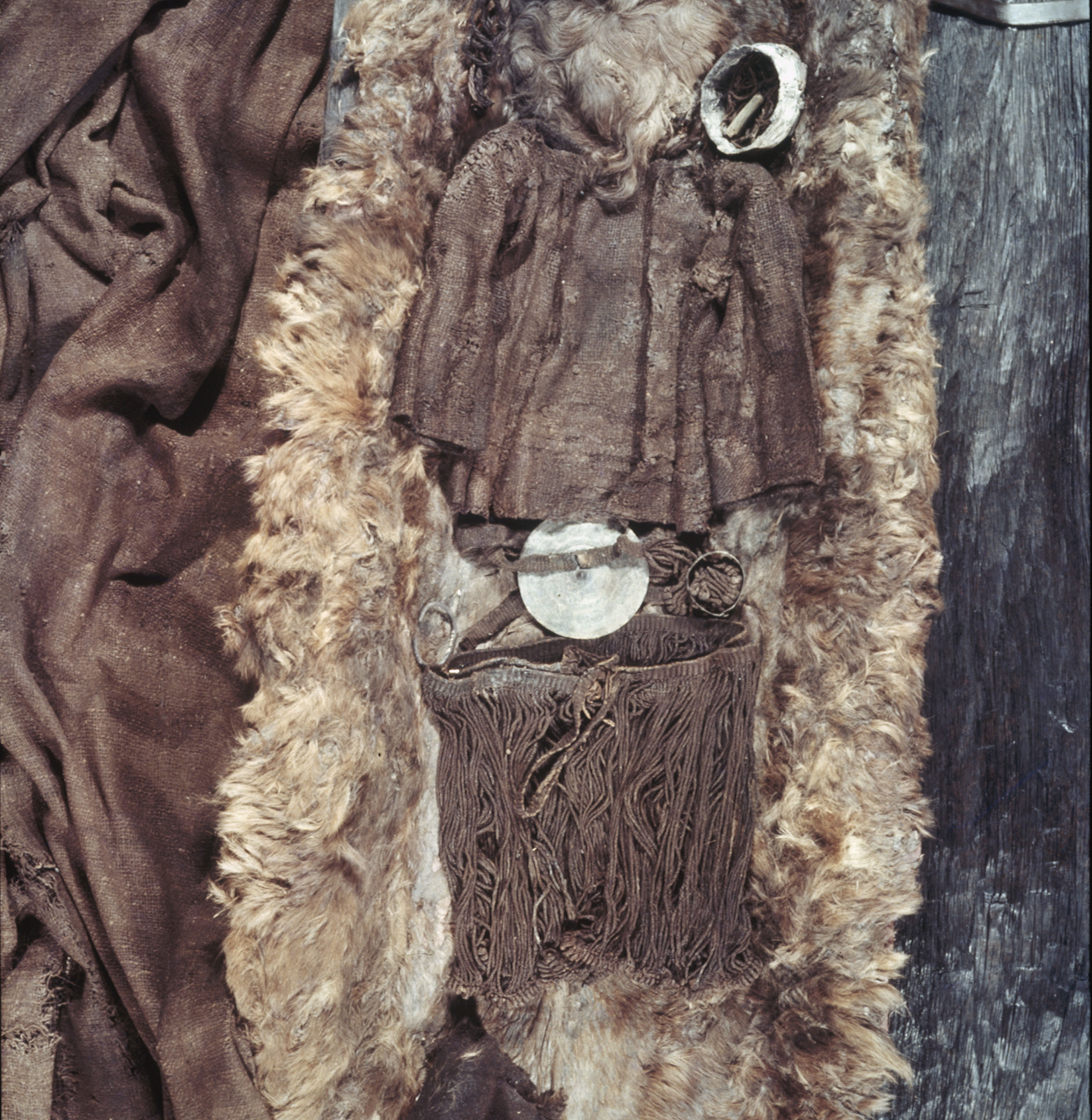 Egtvedpigen lå på ryggen, iført en bluse af brun uld og med bronzeringe om hvert håndled. Under blusen kunne man ane den ikoniske bælteplade af bronze, og et skørt af snoede brune uldsnore var viklet to gange om livet. Ved venstre skinneben lå en tøjbylt med de brændte knogler af et 5-6-årigt barn, og ved fødderne stod en spand af birkebark med resterne af en slags honningsødet øl.