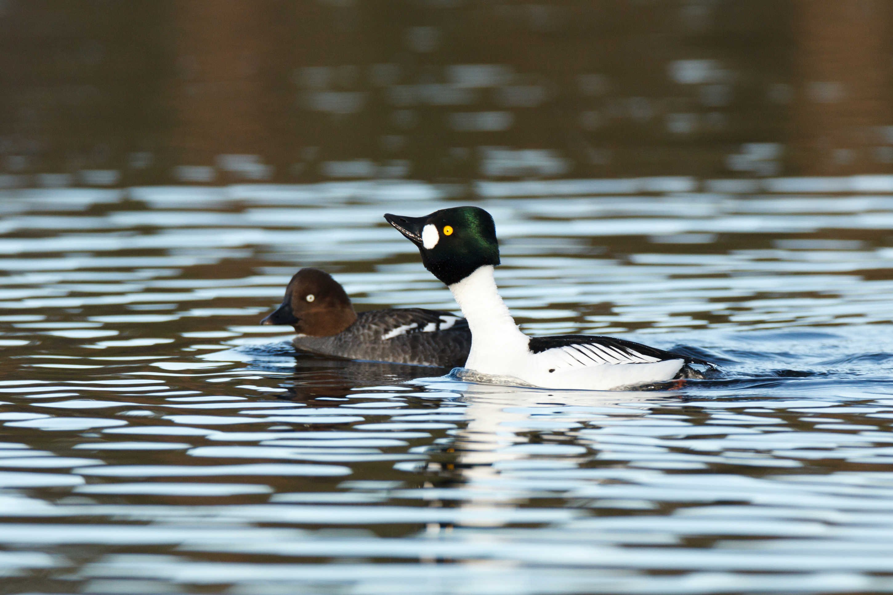 Hvinanden har fået sit navn, fordi vingerne frembringer en hvinende lyd, når den flyver – typisk lavt lige over fjorden. Du kan opleve den om vinteren i store flokke i inderfjorden eller parvis han og hun som på billedet.