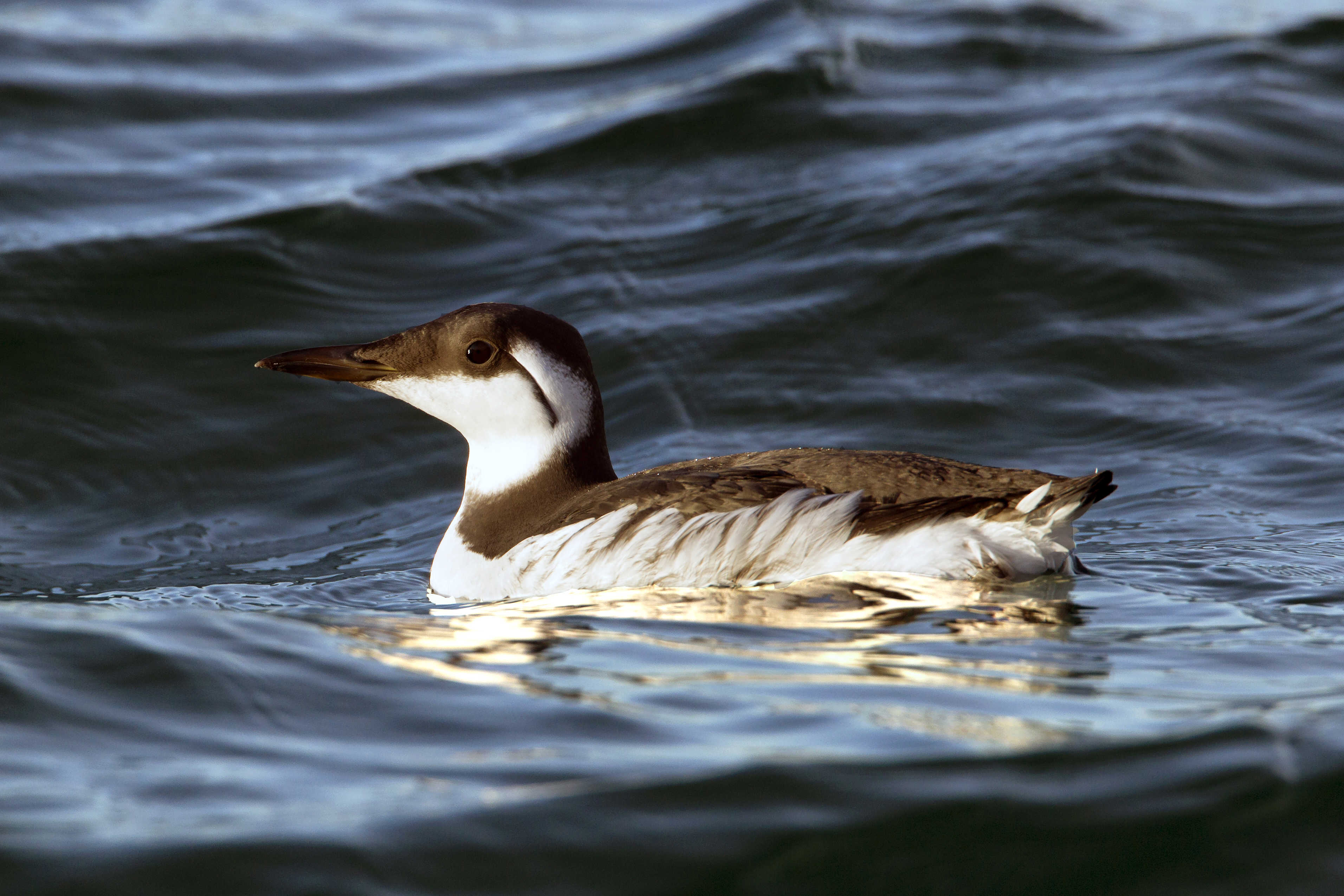 Lomvien ligner alken, men næbbet er mere spidst. Den kommer kun på land i yngletiden, så du vil aldrig opleve den sidde på bolværket her på havnen. Den vil altid ligge på vandet ligesom mange andre havfugle.