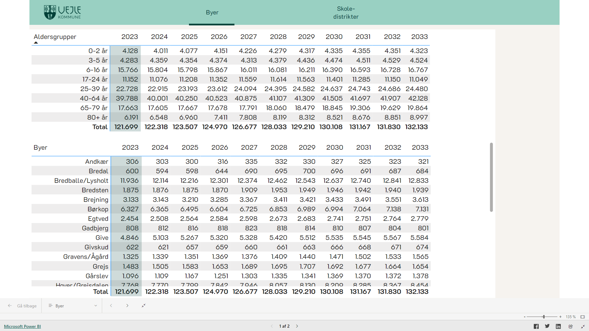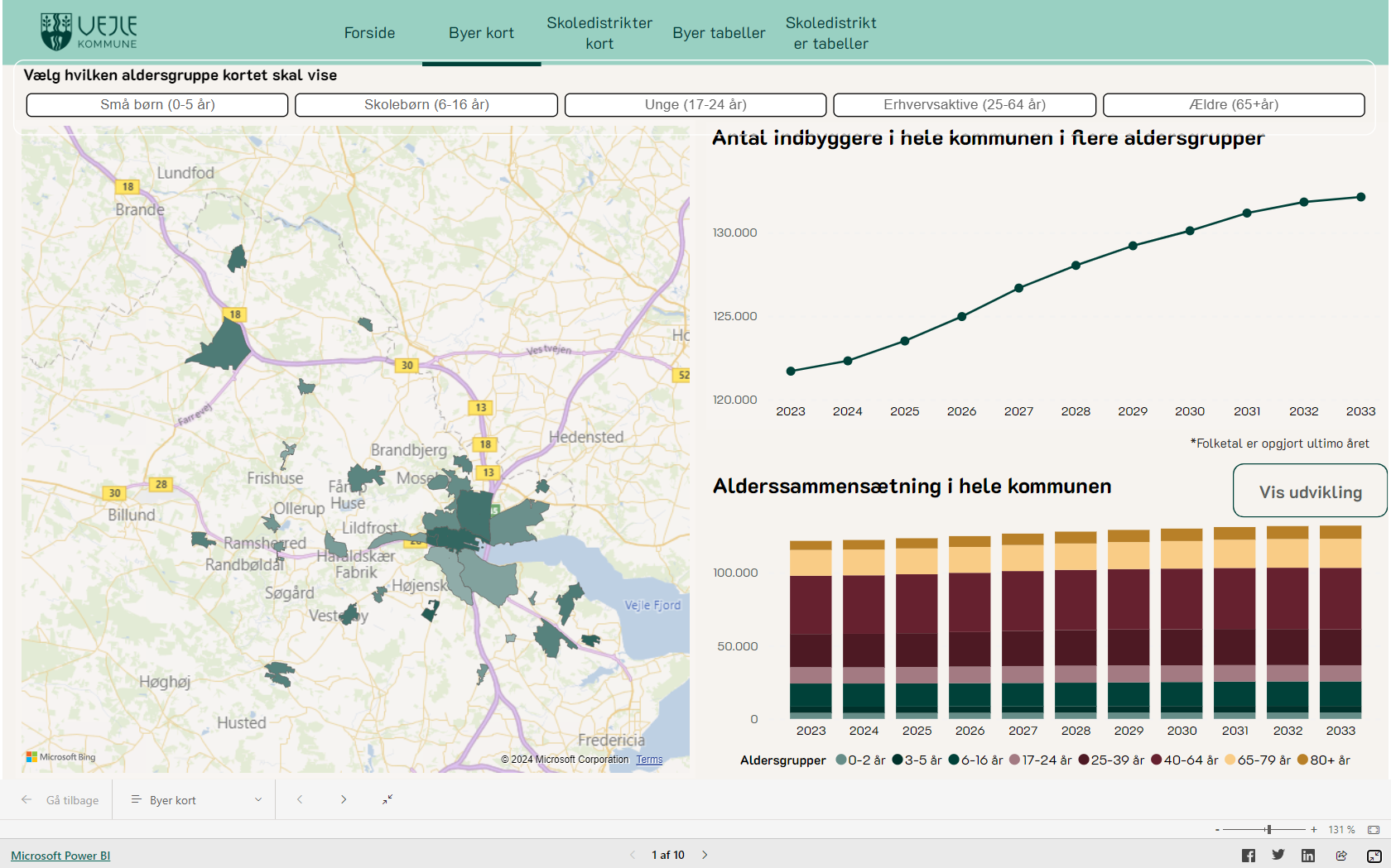 Du kan se befolkningsprognosen 2024-2034 opdelt på skoledistrikter og byniveau. Vælg selv, om du vil se prognosen grafisk eller som tabel.