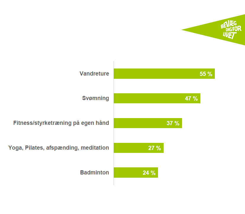 Foruden vandreturene er borgerne i Vejle Kommune især glade for at dyrke fitness på egen hånd og på hold samt løbeture og svømning.