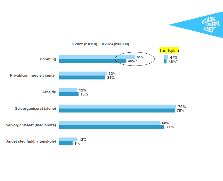 Langt størstedelen af borgerne er aktive på egen hånd eller sammen med andre i selvorganiseret regi - henholdsvis 78 procent og 71 procent i 2023. Mens lidt under halvdelen af borgerne dyrker idræt eller motion i foreninger.