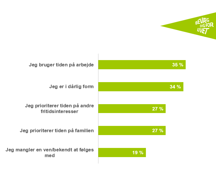 De to primære årsager til ikke at dyrke idræt og motion er at bruge tid på arbejde og at være i dårlig form, hvilket henholdsvis 35 procent og 34 procent af de ikke-idrætsaktive borgere svarer i undersøgelsen.