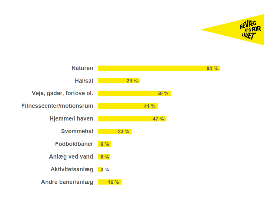 Naturen er det mest fortrukne sted at dyrke idræt og motion i Vejle Kommune, og faktisk er det hele 84 procent, som benytter naturen til formålet. Dernæst foretrækker borgerne at motionere på ’Veje, gader, fortove ol.’ og ’Hjemme / i haven’.