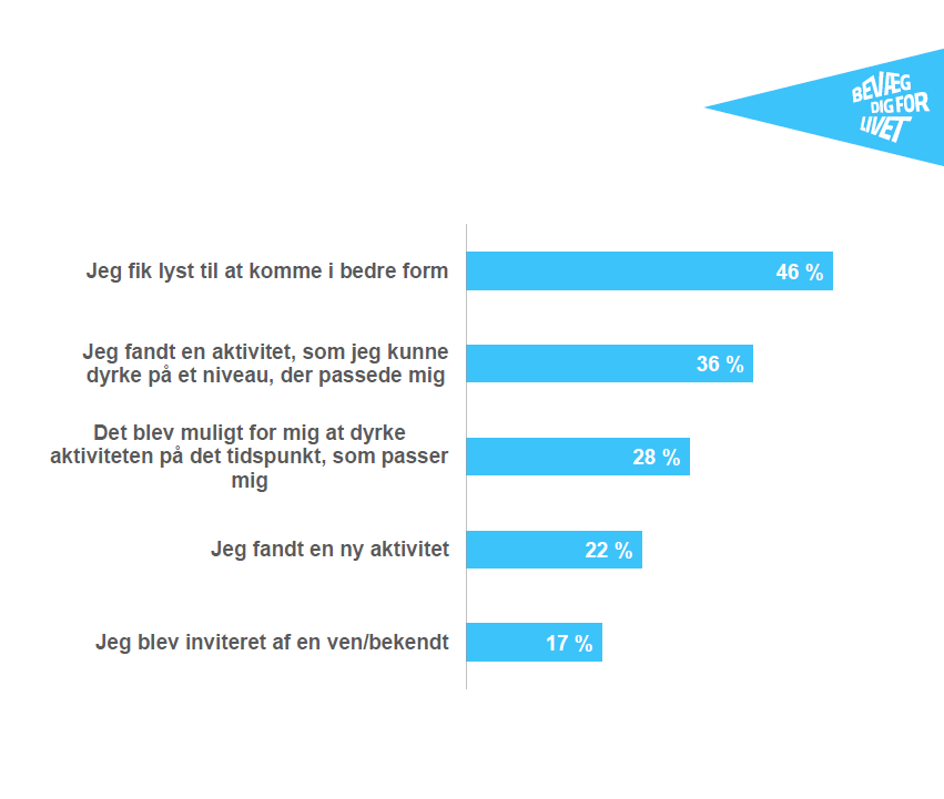 Den vigtigste årsag til at starte på en ny aktivitet er lysten til at komme i bedre form, hvilket 46 procent svarer i undersøgelsen. Samtidig har det stor betydning for borgerne at aktiviteten kan dyrkes på et passende niveau og et passende tidspunkt.