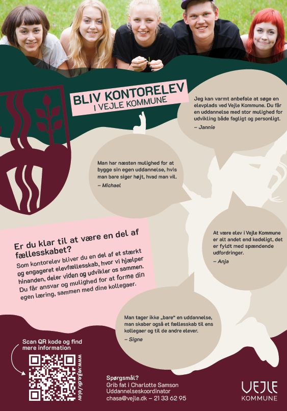 Drømmer du om en alsidig uddannelse inden for kontorområdet, hvor du får erfaring i forskellige afdelinger, og vil du gerne arbejde med offentlig administration, økonomi og have borgerkontakt? Så bliv kontorelev i Vejle Kommune.