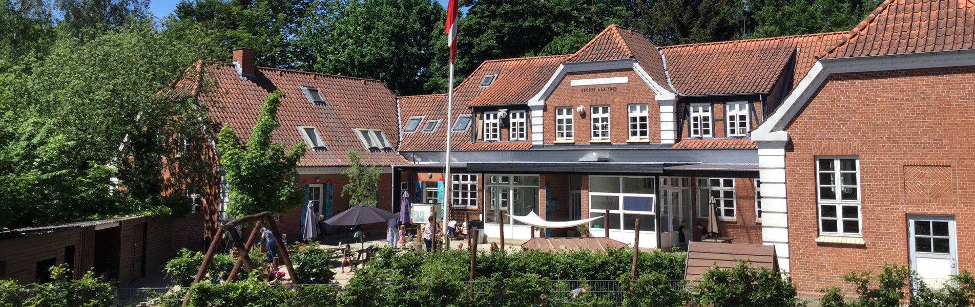 Vi har mange små rum og et stort udenomsareal med legeplads til både vuggestuen og børnehaven, fodboldgård og en gammel vildtgroet have, der efterhånden er blevet til en lille skov med skrænter og klatretræer.