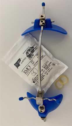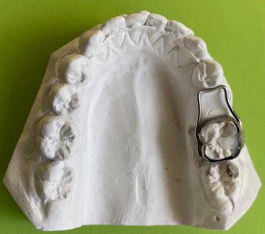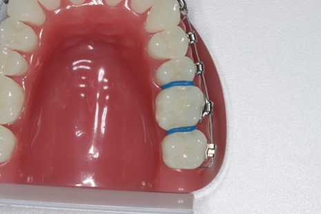 Den er fastgjort til 6-års tænderne med 2 bånd.